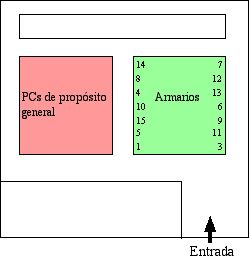 Las mesas de la zona 2 se encuentran flanqueadas por armarios de más de 2m de alto que contienen variado equipamiento necesario para la realización de prácticas. Los armarios están numerados tal y como se ve en la figura 1.